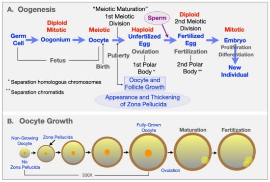 Oogenesis is the process by which unfertilized eggs are produced in the ovary (Figure 1 and Figure 2). It begins early in fetal development with formation of primordial germ cells (PGCs) that are converted into oogonia (mitotic) and then into oocytes (meiotic) in the fetus and finally into unfertilized eggs in sexually mature adults [14,15,16] (Figure 2A). Following gonadal sex differentiation, embryonic day 12–13 in mice, conversion of PGCs into oogonia is completed. Oogonia enter first meiotic prophase and are converted into oocytes at various stages of meiotic prophase. In mice it takes about 4 days for oocytes to complete nuclear progression from leptotene to diplotene of meiosis with chromosomes exhibiting chiasmata due to recombination and crossing over. Following birth, most oocytes are arrested in late diplotene, the dictyate stage, where they remain until stimulated to resume meiosis at the time of ovulation. This pool of small, non-growing oocytes that lack a ZP is the sole source of unfertilized eggs in the sexually mature adult.