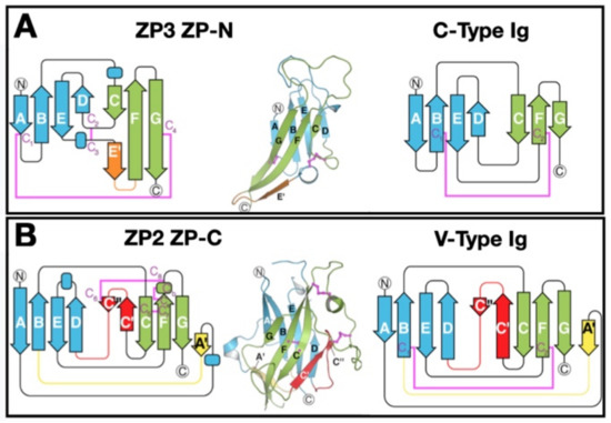 Both the ZP-N and ZP-C subdomains adopt immunoglobulin (Ig)-like folds despite the complete absence of sequence identity [11,66,85,89,90,91,92,93] (Figure 4). The ancestral gene for the Ig superfamily may have originated ≈ 750 million years ago in invertebrates as a primitive sandwich-like fold used in extracellular recognition systems (cell–cell and/or cell–matrix) [94]. The ZP-N and ZP-C sandwich-like folds resemble C- and V-type Ig-like domains, respectively [11]. The ZP-N fold consists of an antiparallel sandwich of two β-sheets made up of eight strands of polypeptide that enclose a hydrophobic core, with two buried disulfides that clamp both sides of the sandwich. The ZP-C fold also consists of a β-sandwich of stacked β-sheets, one with four and the other with six strands, that resemble a Greek key-like motif characteristic of Ig-like domains [95]. The similar structures of ZP-N and ZP-C suggests that the ZPD may have arisen by duplication of an ancestral gene encoding a protein with one ZP-N subdomain.