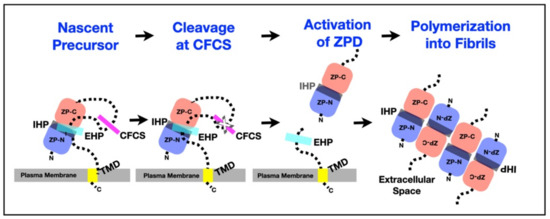 Secretion of ZP proteins is dependent of sequence elements located in the CTP, between the CFCS and TMD, and in the ZPD (Figure 5, Table 2). Nascent ZP proteins have two hydrophobic patches, an EHP in the CTP and an IHP in the ZPD [7,11,78,79,80,81,102]. The EHP and IHP interact and lock nascent ZP proteins in a conformation that prevents formation of ZP fibrils in growing oocytes prior to excision of the CTP at its CFCS. Loss of the EHP results in an unlocking of the ZPD and enables polymerization of ZP proteins to take place [78,79,80,81]. Secretion of nascent ZP proteins by growing oocytes is inhibited when either the EHP or IHP is mutated in the absence of a TMD [78,79,80,81]. The IHP, CFCS must be cleaved for normal levels of secretion of ZP proteins and nascent mZP proteins accumulate in the endoplasmic reticulum when cleavage fails to occur [103,104,105]. The EHP, IHP, CFCS, and TMD regulate incorporation of nascent ZP proteins into the ZP by a coupling of proteolysis and polymerization. The TMD can be replaced by an unrelated TMD without altering its function [80]. Cleavage of inhibitory sequences from protein precursors with concomitant exposure of polymerization elements regulates polymerization of several other kinds of proteins, such as fibrinogen [106], fibrillin [107], and tau protein [108].