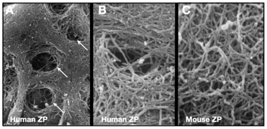 Scanning electron micrographs of the surface of human and mouse oocytes. (A) Human oocyte showing the presence of many pores (9000× magnification) on the outer surface of the ZP. (B) Higher magnification of a human oocyte showing the fibrillar organization of the ZP (50,000× magnification); fibrils are 0.1–0.4 μm long and 10–14 nm wide. (C) Outer surface of a mouse oocyte showing the fibrillar organization of the ZP (50,000× magnification). Samples were treated with saponin–ruthenium red–osmium–thiocarbohydrazide to reveal ZP fibrils. This figure was adapted with permission from G. Familiari ([113], Figure 3), Copyright 2012.