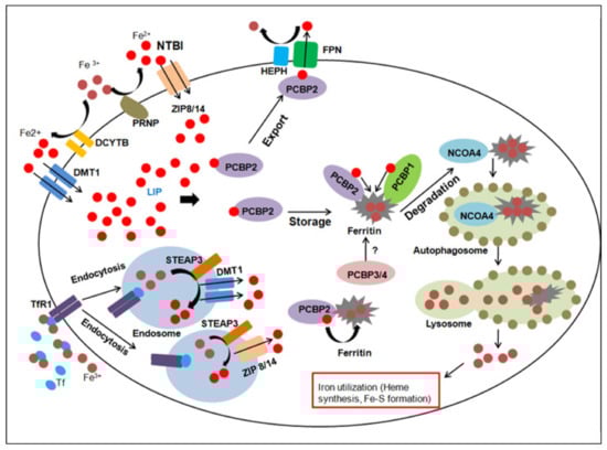 Dietary iron is principally absorbed by enterocytes of the duodenum by the divalent metal transporter 1 (DMT1) in the ferrous (Fe2+) state after being reduced from ferric (Fe3+) state by the duodenal cytochrome B (DCYTB). While transferrin-bound iron is taken up by the transferrin receptor (TfR1), non-transferrin-bound iron (NTBI) was recently discovered to be taken up by the ZRT/IRT like protein members (ZIP 8,14) in association with the ferrireductase prion protein (PRNP). Transferrin-bound iron is internalised into acidic endosomes by ‘endocytosis’, released from TfR1 and reduced to Fe2+ state by the epithelial antigen of prostate 3 (STEAP3). Fe2+ iron is released from endosomes into the cytoplasm by DMT1 and ZIP 8/14. The cytosolic labile iron pool (LIP) composed of Fe2+ may be delivered to the iron exporter ferroportin (FPN) by members of iron chaperones i.e., poly-(rC)-binding proteins (PCBPs). Iron is finally exported out of the cell into the circulatory system via the copper-dependent ferroxidase hephaestin (HEPH). PCBP 1 and 2 may also transport Fe2+ to ferritin, where it is oxidised to Fe3+ and stored in an intracellular non-toxic form. Iron-loaded ferritin may also undergo degradation by autophagy with the aid of the nuclear receptor coactivator 4 (NCOA4), which releases iron for cellular use, such as in synthesis of heme or iron sulphur cluster (Fe-S) formation.