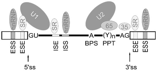 Alternative splicing is known to be regulated by a complex process in which cis-acting elements and trans-acting splicing factors are involved [3]. Cis-acting elements include exonic/intronic splicing enhancers (ESE/ISE) and silencers (ESS, ISS) within the pre-mRNA. Trans-acting factors include the well-characterized splicing regulators are serine–arginine-rich (SR) family proteins, the auxiliary factor of U2 small nuclear ribonucleoprotein (U2AF), heterogeneous ribonucleoproteins (hnRNPs), etc. Thus, multiple splicing factors, such as SR proteins and hnRNPs, regulate exon removal or its inclusion into forming mRNA through binding exonic/intronic splicing enhancers or exonic/intronic splicing silencers in the pre-mRNA [21] (Figure 2).