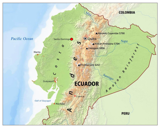 Map showing the reference location of samples investigated in the present study. The red dot indicates the city of Santo Domingo de los Tsachilas within the homonym canton.