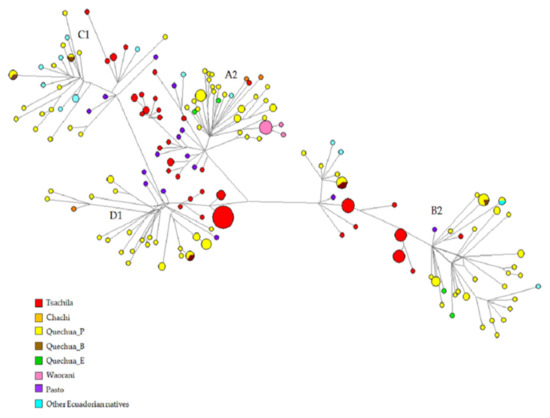 Median joining network for A2, B2, C1, and D1 haplotypes of mtDNA entire genomes (n = 313) among Peruvian, Bolivian, Colombian, and Ecuadorian populations color-coded by ethnicity/linguistic affiliation. The haplotypes are represented by circles with sizes proportional to the number of individuals and branch lengths proportional to the number of mutational steps. The Quechua populations are divided by country (Peruvian, Bolivian, and Ecuadorian Quechua are indicated by Quechua_P, Quechua_B, and Quechua_E, respectively).
