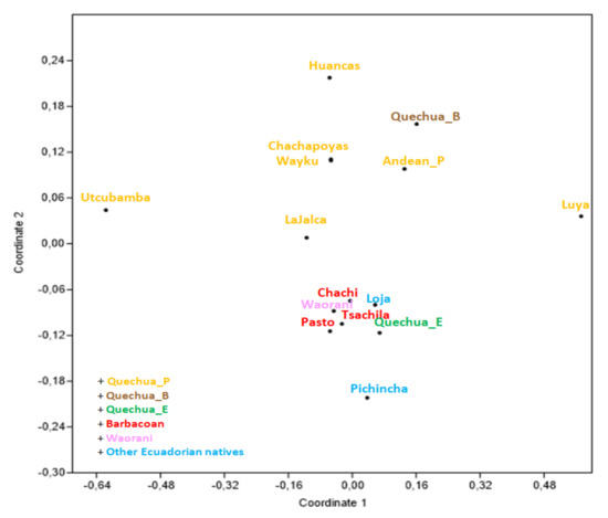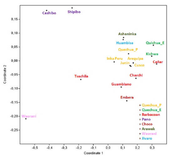 Based on the same dataset that we used for the network (Table S5), we built a matrix of pairwise genetic distances (φst), assigning each haplotype to one of the 15 Ecuadorian, Peruvian, Bolivian, or Colombian populations on the basis of ethnicity or language in order to elaborate a nMDS plot (Figure 3). It can be noticed that the Tsachila clearly point towards the other populations from Ecuador together with Pasto, a Barbacoan population from Colombia, while all of the other Peruvian and Bolivian Quechua occupy the upper part of the plot.