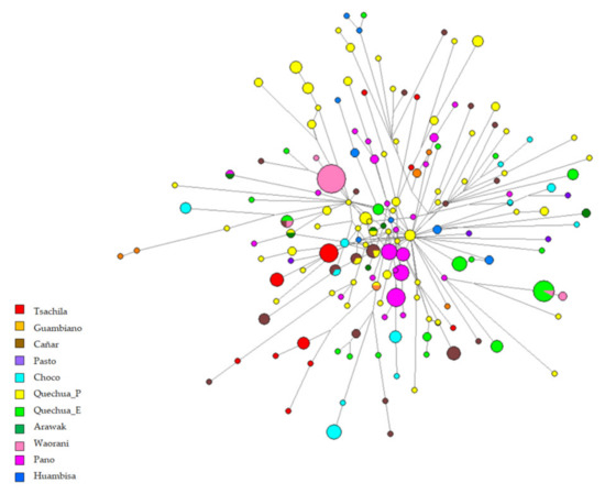 The network of Y-STRs haplotypes was only built with the Q-M3* haplotypes selected from the Y chromosome dataset since it was the unique haplogroup detected in our sample (Figure 4). The absence of shared nodes between Tsachilas individuals and other haplotypes is a common trait between the two uniparental markers. If compared tothe MJ network obtained from mitochondrial haplotypes, the phylogenetic relationships of male lineages highlighted a closer relationship between some Tsachilas and Peruvian Quechua nodes (including Peruvians of Inca kinship, published by Sandoval et al. [55]), while the other haplotypes show a relatedness with the Ecuadorian Cañar and Pasto and the Guambiano from Colombia (all affiliated with the Barbacoans).