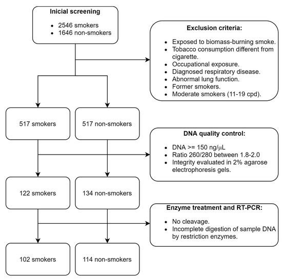 The study was observational and retrospective, performed at the Instituto Nacional de Enfermedades Respiratorias Ismael Cosío Villegas (INER) in Mexico City; we selected samples of genomic DNA from the HLA Laboratory biobank. The participants were recruited from 2012 to 2019. The inclusion criteria for patient selection were as follows: Mexican mestizo ancestry (parents and grandparents born in Mexico), adults, non-smokers, or current smokers with normal lung function values. A specialized pulmonologist performed a physical examination and pre-bronchodilator spirometry, with reference values for the Mexican population used for the clinical assessment [19]. Individuals with exposure to biomass-burning smoke, other types of tobacco consumption and marijuana, occupational exposure including organic and inorganic dust, chemical agents and fumes, intensive air pollution (e.g., sculptors, gardeners, and warehouse workers), or diagnosed respiratory disease (COPD, bronchial asthma, bronchiectasis, active tuberculosis, lung cancer, cystic fibrosis, hypersensitivity pneumonitis, or idiopathic pulmonary fibrosis) were excluded from the study (Figure 1). The participants completed a questionnaire regarding demographical data and family history. In addition, a 7 mL sample of peripheral blood was collected in EDTA tubes. The individuals agreed to participate voluntarily and signed an informed consent document specifically for this protocol, previously approved by the INER research and biosafety bioethics committees (protocol code number B26-20).