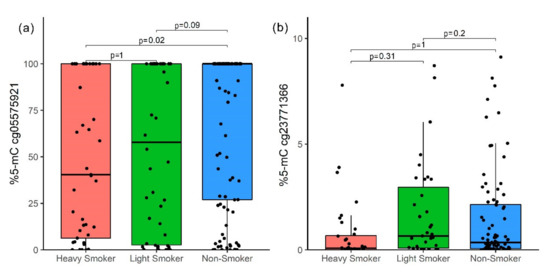 The 5-mC percentage between HS, LS, and NS for the cg05575921 site was minor (medians of 40.43%, 57.86%, and 100%, respectively) for higher cpd (p = 0.01); however, after post-hoc correction, there was only a difference between HS and NS (p = 0.02, Figure 3a). The cg23771366 site did not show statistical differences (Figure 3b).