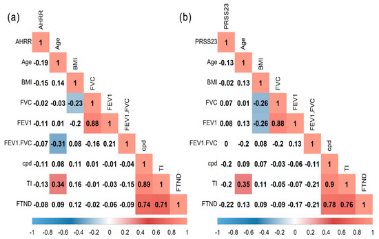 Spearman correlation matrix in tobacco smokers’ group. (a) cg05575921 (AHRR) site and (b) cg23771366 (PRSS23) site. BMI, body mass index; FVC, forced vital capacity; FEV1, forced expiratory volume in the first second; cpd, cigarette per day; TI, tobacco index; FTND, Fagerström test for nicotine dependence.