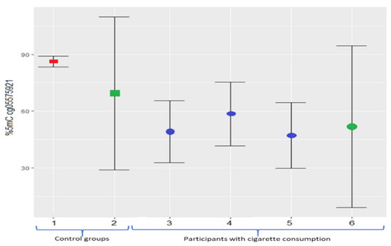 Our methylation levels for cg05575921 were similar to previous reports realized in different populations with tobacco consumption [20,25,32,62,63] and non-smokers [25,63], showing replicable results in most populations studied; this is relevant because, previously, cg05575921 has been proposed as a biomarker of smoking status since DNA methylation is not affected by short-term abstinence periods [32].
