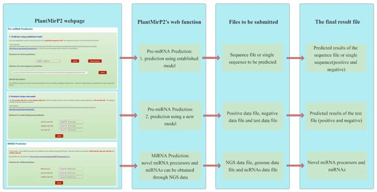 PlantMirP2 was constructed in python and Perl according to the flowchart (Figure 1). Fundamental packages from the python and perl library were also used. More details can be seen in the links below. The local package of plantMirP2 is provided at https://github.com/wuqiansibai/plantMiRP2/releases/tag/v1.0/ (accessed on 16 August 2021) and the related Dockerfile is provided at https://github.com/wuqiansibai/plantMiRP2/releases/tag/Dockerfile/ (accessed on 16 August 2021). All scripts have been tested on CentOS. For the convenience of users, we also provide the webserver of plantMirP2 (http://plantmi.top/, accessed on 16 August 2021) for pre-miRNA prediction, and direct miRNA prediction (Figure 2) from NGS data based on miRDeep-P2 [], which used an a priori probability model specifically designed to overcome more variations in the length of pre-miRNAs and problems of more prevalent large paralogous families in plant NGS data.