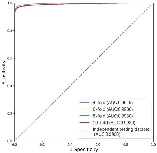 ROC (Receiver Operating Characteristic) curves and corresponding AUC (Area Under Curve) values of the 4-, 6-, 8- and 10-fold CVs (Cross-Validations) based on the training dataset and the independent testing dataset.