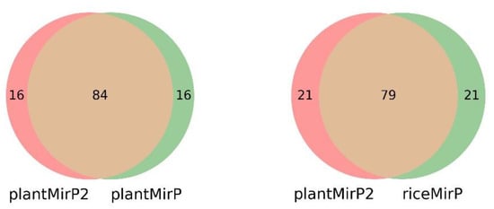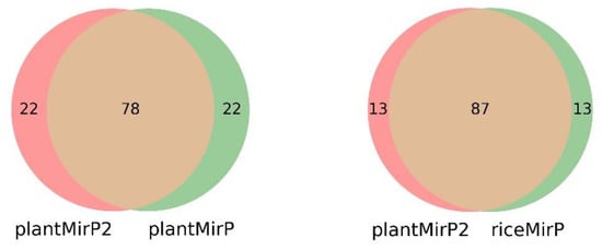Venn diagram results for the top predictions of plantMirP2, plantMirP and riceMirP.