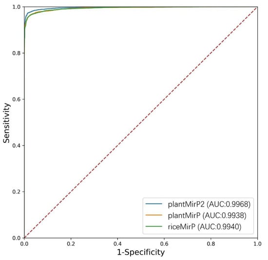 The ROC curves of plantMirP, riceMirP and plantMirP2.