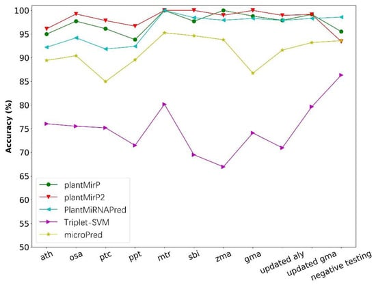 Based on the training and testing datasets from PlantMiRNAPred, the prediction accuracies of plantMirP, plantMirP2, PlantMiRNAPred, Triplet-SVM and microPred were compared.