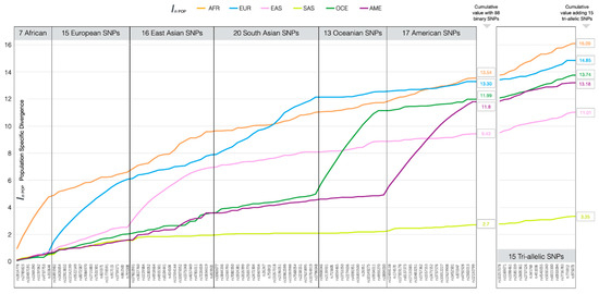 Accumulating population specific divergence values for each of the main population groups and the six sets of SNPs informative for their differentiation. The cumulative values are shown obtained from 88 binary SNPs (i.e., excluding 12 Eurasian-informative SNPs) and from the addition of the 15 tri-allelic SNPs in BT (VISAGE Basic Tool).