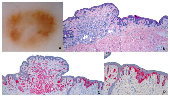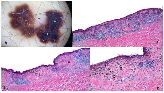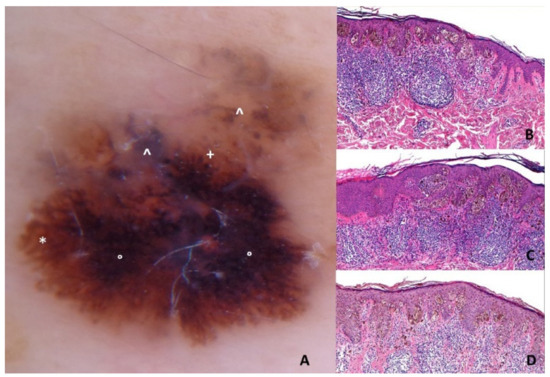 - Borsari, S.; Longo, C.; Ferrari, C.; Benati, E.; Bassoli, S.; Schianchi, S.; Giusti, F.; Cesinaro, A.M.; Pellacani, G.; Seidenari, S. Dermoscopic Island. Arch. Dermatol. 2010, 146, 1257–1262. [Google Scholar] [CrossRef] [PubMed][Green Version]