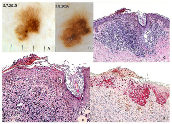 - Apalla, Z.; Nikolaidou, C.; Lallas, A.; Sotiriou, E.; Lazaridou, E.; Venizelos, I.; Bobos, M.; Efstratios, E.; Ioannides, D.; Ferrara, G. Clinicopathologically problematic melanocytic tumors: A case-based review. Dermatol. Pr. Concept. 2018, 8, 306–313. [Google Scholar] [CrossRef] [PubMed]