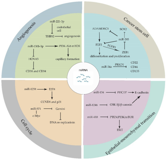 Recent studies have expanded our understanding of the interplay among tumor initiation, progression, recurrence, and the biogenetic markers of angiogenesis, therapy-resistance, invasion, as well as metastasis activation [41]. When compared with normal tissue, miRNAs are often dysregulated in tumors. The abnormally expressed miRNAs have been proven to manipulate stemness, angiogenesis, proliferation, apoptosis process, cell cycle, and the epithelial–mesenchymal transition (EMT) of tumor cells. miRNAs regulate individual target genes directly. Moreover, one miRNA can regulate several target genes, which means a single miRNA modulates a brunch of biological functions.