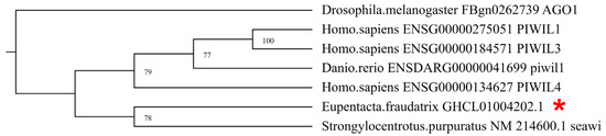 Phylogenetic tree showing the relationships of the Piwi sequence of E. fraudatrix (marked with the asterisk) with homolog proteins of other animals.