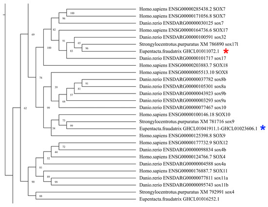 Part of the phylogenetic tree showing the relationships of Sox of the E. fraudatrix with homolog proteins of other animals. Ef-Sox9/10 is marked with a blue star, and Ef-Sox17 is marked with a red star.