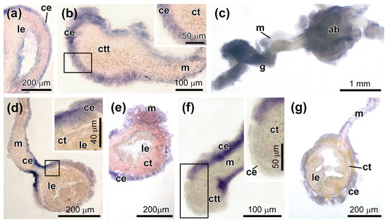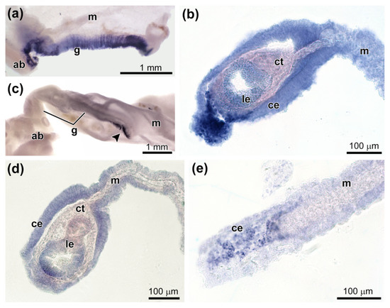 After 5–7 dpe, Ef-tensilin3 transcripts were found in the coelomic epithelium of the mesentery and gut anlage (Figure 7 and Figure 8a,b). The most intense expression was located in the ventral part of the forming digestive tube. In the course of regeneration, the intensity of the expression decreased. In some individuals, during this period, the Ef-tensilin3 transcripts formed only a narrow stripe, which expanded somewhat in the posterior part of the anlage. After 10 dpe, the highest expression of this gene occurred only in the growing tip of the gut (Figure 8c). Moreover, Ef-tensilin3 mRNA was detected in the coelomic epithelium of the gut anlage and the ventral part of the mesentery (Figure 7 and Figure 8d,e). Furthermore, transcripts of the gene were found in the ventral part of the luminal epithelium (Figure 7 and Figure 8d).
