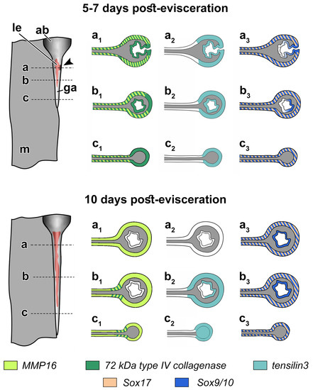 - Quiñones, J.L.; Rosa, R.; Ruiz, D.L.; García-Arrarás, J.E. Extracellular matrix remodeling and metalloproteinase involvement during intestine regeneration in the sea cucumber Holothuria glaberrima. Dev. Biol. 2002, 250, 181–197. [Google Scholar] [CrossRef] [Green Version]