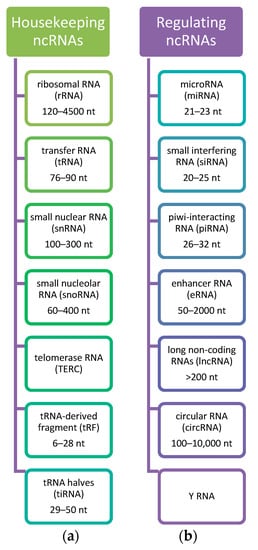 These ncRNAs may be categorized and classified into different groups according to size and their function. Thanks to the advances in deep sequencing technologies, ncRNAs are classified into small ncRNAs (<200 nt, including piwi-associated RNAs, endogenous short-interfering RNAs, microRNAs, and Y-RNAs), and long ncRNAs (lncRNAs, >200 nt) [49]. By function, they are categorized into ribosomal RNAs (rRNAs), transfer RNAs (tRNAs), circular RNAs (circRNAs), small nuclear RNAs (snRNAs), small nucleolar RNAs (snoRNAs), microRNAs (miRNAs), long non-coding RNAs (lncRNAs), transcription initiation RNAs (tiRNAs), and piwi-interacting RNAs (piRNAs) [54,56,57]. The classification of ncRNAs is presented in Figure 1.