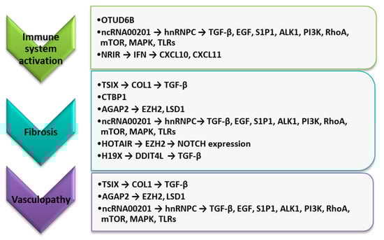 Moreover, they found that lncRNAs may be involved in the upregulation of genes belonging to the type α- and β-interferon signaling pathways, as well as the increased regulation of interleukin-6 (IL-6), a cytokine playing a major role in inflammatory and autoimmune diseases [43]. In addition, their bioinformatic analysis revealed that ncRNA00201 targets 26 miRNAs, which are regulators of genes such TGF-β receptor, endothelin, epidermal growth factor (EGF) receptor, sphingosine 1 phosphate receptor 1 (S1P1), activin receptor-like kinase 1 (ALK1), ras homolog family member A (RhoA), class I phosphoinositide 3-kinase (PI3K), p38 mitogen-activated protein kinase (MAPK), mammalian target of rapamycin (mTOR), and Toll-like receptors (TLRs) pathways [43]. This finding provides an insight into the SSc pathophysiology.