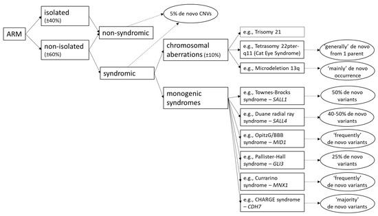 Up to 10% of syndromic ARM are associated with numeric or structural chromosomal anomalies [5,9]. While for the majority of the remaining syndromic phenotypes that cause ARM remain elusive, about 30 known monogenic syndromes have been described with ARM as an associated phenotypic feature. Here, we discuss a selection of genetically defined syndromes with special emphasis on de novo variation (Figure 1).