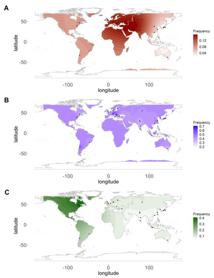 World map showing frequency of primary LHON variants. (A) Frequency of m.3460G>A, (B) m.11778G>A, and (C) m.14484T>C variants. The black dots represent the regions from which samples were included in the publication.