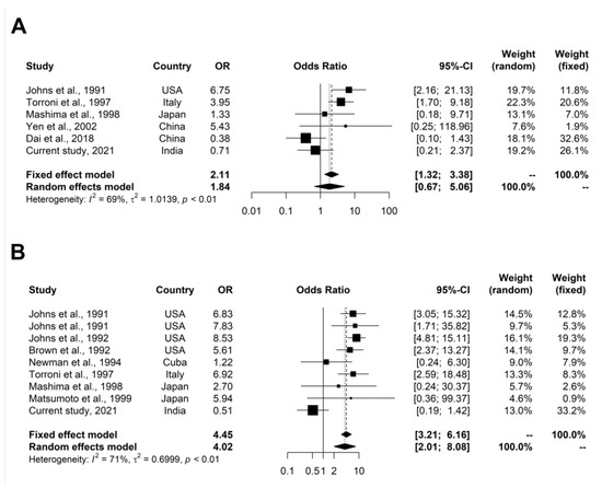 Forest plot showing odds ratios (ORs) for individual studies and pooled odds ratio (OR) using both fixed- and random-effect models of meta-analysis for (A) m.4216T>C variant and (B) m.13708G>A variant.