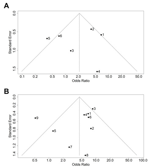 Funnel plot representing publication bias in the studies involving (A) m.4216T>C variant and (B) m.13708G>A variant.