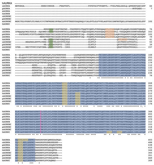 - Seeling, J.M.; Farmer, A.A.; Mansfield, A.; Cho, H.; Choudhary, M. Differential selective pressures experienced by the aurora kinase gene family. Int. J. Mol. Sci. 2017, 19, 72. [Google Scholar] [CrossRef] [PubMed] [Green Version]