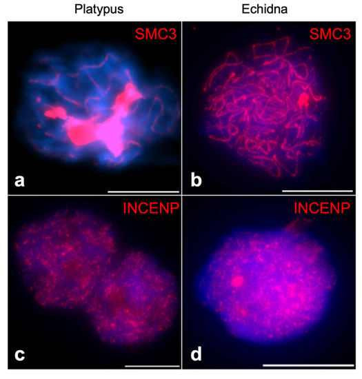 - Casey, A.E.; Daish, T.J.; Barbero, J.L.; Grützner, F. Differential cohesin loading marks paired and unpaired regions of platypus sex chromosomes at prophase I. Sci. Rep. 2017, 7, 4217. [Google Scholar] [CrossRef] [PubMed] [Green Version]