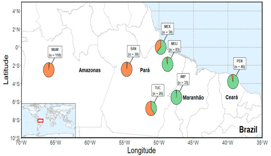 - Fazzi-Gomes, P.; Aguiar, J.; Cabral, G.F.; Marques, D.; Palheta, H.; Moreira, F.; Rodrigues, M.; Cavalcante, R.; Souza, J.; Silva, C.; et al. Genomic approach for conservation and the sustainable management of endangered species of the Amazon. PLoS ONE 2021, 16, e0240002. [Google Scholar] [CrossRef]
