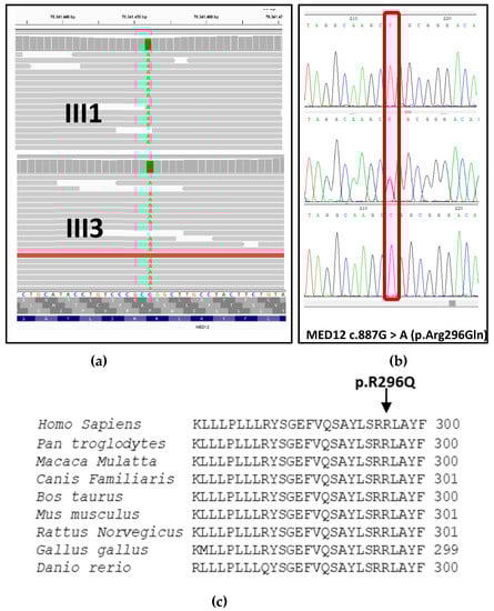 - Bouazzi, H.; Lesca, G.; Trujillo, C.; Alwasiyah, M.K.; Munnich, A. Nonsyndromic X-linked Intellectual Deficiency in Three Brothers with a Novel MED12 Missense Mutation [c.5922G>T (p.Glu1974His)]. Clin Case Rep. 2015, 3, 604–609. [Google Scholar] [CrossRef]
