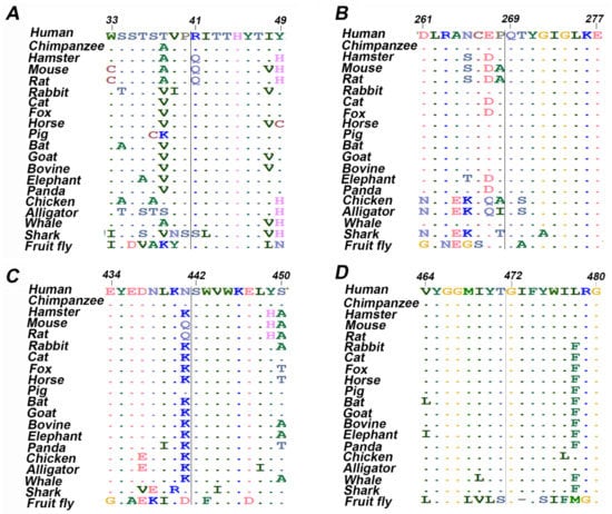 Multiple sequence alignment of twenty amino acids centered on the missense mutation obtained from different organisms. (A) ETF-QO, R41L; (B) ETF-QO, Q269H; (C) ETF-QO, S442L; (D) ETF-QO, G472R.