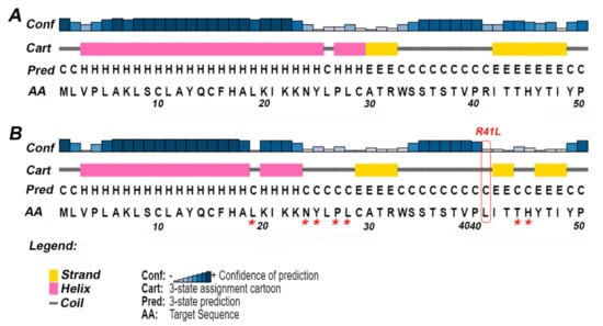 The secondary structure of ETF-QO predicted by PSIPRED. For clarity, only the effect of the missense variant Arg41Leu has been shown. The predicted full-length sequence of ETF-QO is shown in Supplementary Figure S2. (A) Secondary structure of wild type ETF-QO; (B) secondary structure of ETF-QO with R41L variant. The square box shown in red represents the location of mutation and the asterisk (*) shows the position of change in secondary structure in mutant ETF-QO.