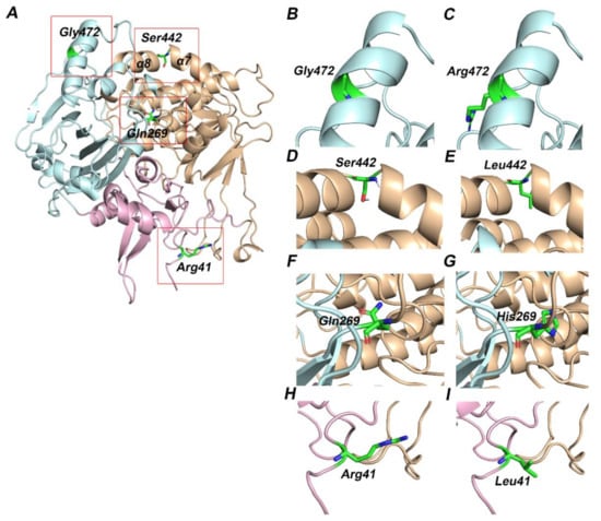 Three-dimensional structure of ETF-QO protein. The functional domains of ETF-QO protein—FAD (orange), UQ (cyan), and 4FE4S cluster (pink) are shown in cartoon representation and amino acids are shown in stick representation. The red boxed regions in A are magnified in the successive images. (A) Modeled structure of ETF-QO; (B) wild type Gly472; (C) mutant Arg472; (D) wild type Ser442; (E) mutant Leu442; (F) wild type Gln269; (G) mutant His269; (H) wild type Arg41; (I) mutant Leu41.