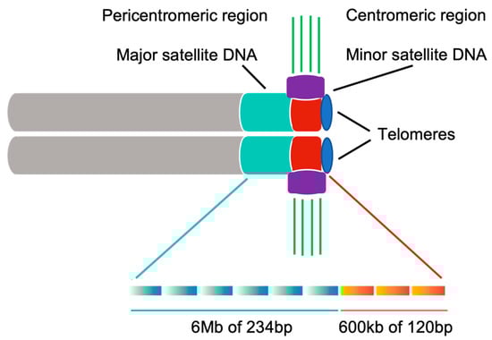 A notable effort has been put into identifying centromere DNA sequences in various organisms, but no universal centromere sequence has been found. On the contrary, centromeric DNA between various organisms differs significantly []. In mouse, the centromeric region is defined by euchromatin epigenetic markers and repetitive centromeric DNA sequences, which are enriched in minor satellite repeats (600 kbp of 120 bp sequences) (Figure 2) []. Minor satellite DNA is the prominent site for CENP-A and CENP-B assembly [,]. However, if the minor satellite region is not big enough, CENP-A can also be formed de novo elsewhere and its localization is not strictly sequence dependent [,,,]. CENP-B is a minor satellite DNA binding protein. Despite the centromere sequence variety across species, the CENP-B box (17 bp DNA) is highly conserved between rodents and primates []. The mouse pericentromeric region contains inactive chromatin and is composed of major satellite repeats (6 Mbp of 234 bp monomers) (Figure 2) [], which is required for heterochromatin formation [,]. However, the role of major satellite DNA in cell division is still unclear. Pericentric regions act as insulators for the centromere and are epigenetically distinct due to specific histone modifications. Unlike centromere-specific CENP-A, pericentromere contains histone variants H3.3 and H2A.Z. Pericentric histones are generally hypoacetylated and exhibit some methylation marks on histones H3 and H4 that cannot be found in centromeric region [].