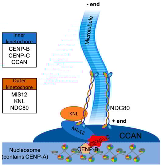 In vertebrates, kinetochores are composed of more than 100 proteins, which together form inner and outer layers of kinetochore (mediating contacts with chromatin and microtubules, respectively) controlled by other regulatory proteins [,]. One of the critically important group of protein complexes involves the so-called constitutive centromere-associated network, or CCAN—together with specialised centromeric chromatin marked by histone CENP-A, these proteins participate in formation of the inner layer of kinetochore (Figure 3). Many proteins participate in the formation of CCAN, including subcomplexes CENP-C, CENP-H-I-K-M, CENP-L-N, CENP-O-P-Q-R-U, and CENP-T-W-S-X. Based on CCAN, the outer kinetochore is assembled to bind microtubules directly and transduces the force required to move chromosomes during metaphase and anaphase. Its core is composed of 10-subunit complexes, termed KMN (Knl1 complex, Mis12 complex, Ndc80 complex) [,,,]. Additionally, more proteins are involved in the kinetochore organization at meiosis, such as cohesins [].