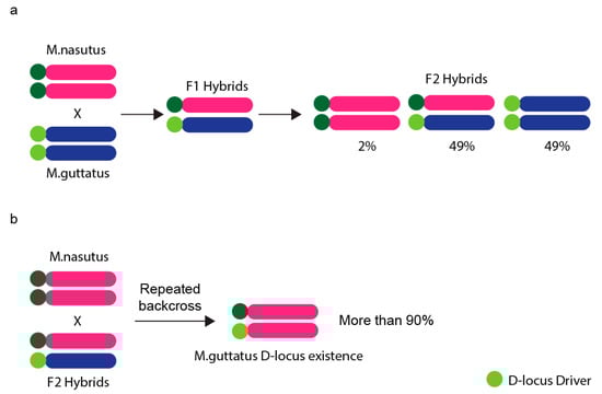 There are some well-documented instances of meiotic drive in plants, too. Perhaps the most iconic one is found in maize, where four knobs on so called abnormal chromosome 10 (Ab10) act as neocentromeres enhancing transmission of Ab10 (and also the rest of chromosomes containing knobs in the presence of Ab10) preferentially to megagametophyte (Table 1) []. Apart from neocentromeres, centromeres were thought to possibly act as driving elements already in 2001 [,,], renaming the mechanism as centromere drive. However, this was not demonstrated in natural populations to explain meiotic drive until 2008 [,]. To understand the role of the centromere in the meiotic drive, F1 hybrid monkey flowers were generated by crossing Mimulus nasutus and Mimulus guttatus. The F1 hybrids contain D locus on homologous chromosomes, which is thought to be the centromeric region. Chromosome transmission rate was examined in Mimulus nasutus (maternal; dd) × M. guttatus (paternal; DD) F2 hybrids. According to Mendel’s first law, the expected ratio of D locus in F2 hybrids is Mendelian (1:2:1, dd:Dd:DD). Strikingly, there was a strong transmission bias against the M. nasutus allele—the actual ratio was extremely non-Mendelian (0:2:2, dd:Dd:DD) []. To prove the key role of D locus, F2 hybrids were repeatedly backcrossed with homozygous M. nasutus. Several generations later, it was shown that despite most of the genome originated from M. nasutus, the D locus from M. guttatus was still observed in over 90% of the offspring (Figure 4). Therefore, the extremely biased transmission indicates that the D locus could play a key role in transmission ratio distortion (Table 1 and Figure 4) [,].
