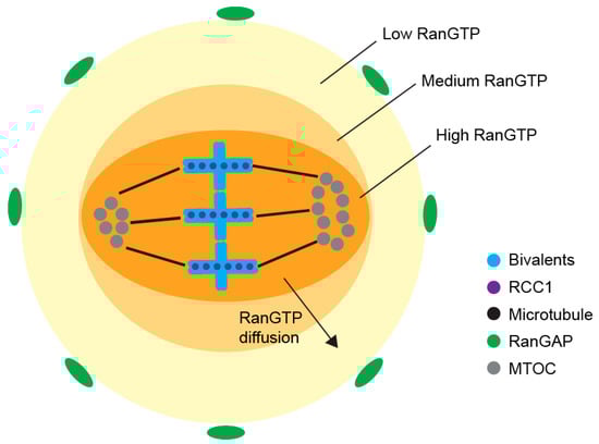 In terms of RanGTP formation, Ran guanosine exchange factor Regulator (Chromosome Condensation 1, RCC1) promotes the transformation of RanGDP to RanGTP, with chromosomes serving as sites of the RanGTP generation []. Diffusion from the chromosomes creates a decreasing RanGTP gradient from the nucleus to the cell cortex (Figure 5) []. Microtubule nucleation and stabilization are supported by RanGTP which activates critical spindle assembly factors (SAFs), such as TPX2 and NuMA, by releasing them from inhibitory Importin-α/β [,,,]. In mitosis, 22 spindle assembly factors were regulated by RanGTP, however, the role of RanGTP in SAFs regulation is still unclear in meiosis. In the cytoplasm, away from chromosomes, RanGTP is converted back to RanGDP by RanGTPase at the edge of RanGTP gradient. In such dynamic system, the size of spindle is considerably restricted [].