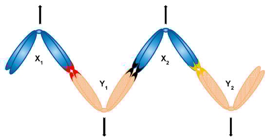 An example of early observations is the mole cricket Neocurtilla hexadactyla, an organism possessing a X1X2Y sex chromosome system. The original study incorrectly identified the X2Y bivalent as a heteromorphic autosome pair, while claiming that the remaining univalent represents the X0 sex chromosome system. Nevertheless, the key observation was made that the larger autosome of the heteromorphic pair always segregates with the remaining X chromosome and the smaller autosome always against it []. This biased segregation was later confirmed to be the segregation of X1X2Y system—indeed, the large autosome is the X2 and the smaller one the Y []. This example shows that the segregation of a multiple sex chromosome system appears to be naturally non-random, as the segregation of X2Y bivalent always occurs so that X2 (and not Y) segregates together with X1. How exactly such form of non-random, regulated segregation is achieved, however, remains a mystery. Likewise, many mammalian species possess X1X2Y neo-sex chromosome system and even more XY1Y2 [] and again, it is unknown how the regulated segregation occurs in these systems. Yet another even more mind-puzzling example is found in heterogametic males of organisms that stably keep their multiple sex chromosomes in form of ring or chain multivalents, or so-called chromosome multiples. Surprisingly, not much research has been done regarding behaviour and segregation pattern of sex chromosome multiples for decades, even though the presence of such multiples has been reported in a number of species []. Notably, some recent research has been done in frogs [,]. Nevertheless, the behaviour and segregation of sex chromosome multiples, as well as respective molecular mechanisms, are still poorly understood. Basically, a sex chromosome multiple can form a chain, ring, or even more complex multivalent structure to achieve regulated segregation. It is widely accepted that in case of chain multiples, the alternate segregation of Xs and Ys is the key. For that, a chain must take a zig-zag orientation (Figure 7), as is the case in Australian huntsman spider Delena cancerides—the species harbouring populations with sex chromosome chains involving 3–19 chromosomes or even populations with two distinctive chains [,,]. Similarly, a peculiar chain of nine or ten sex chromosomes can be found in echidna and platypus, respectively—a situation unique to mammals [,]. In these organisms (and many others possessing long sex chromosome chains, such as termites []), it is unknown what exactly is responsible for the formation of necessary zig-zag configuration resulting to alternate segregation. Several factors have been proposed to be involved, including chiasma or centromere position, or chromosome size. However, these factors do not apply to at least mentioned D. cancerides [], so even if they have some contribution, they are not universal and definite. In addition to that, it has been shown that the assembly of platypus sex chromosome chain during male prophase I is a highly organised pairing process [] and involves differential cohesin loading to paired and unpaired region of sex chromosomes. Specifically, SMC3 subunit of cohesin complex is massively recruited to unpaired regions of sex chromosome chain during zygotene []. It has been shown that SMC3 is required for synapsis of homologs and the assembly of synaptonemal complex might begin precisely at euchromatic sites where SMC3 is most abundant—indeed, knockdown of both SMC1 and SMC3 leads to a complete block of synapsis in Drosophila oocytes, demonstrating that SMC3 is a critical component in the formation of synapsis [,]. Therefore, the presence of cohesins is critical to complement the function of synapsis []. On the other hand, sex chromosomes in platypus are non-homologous except for PARs and therefore do not undergo synapsis, yet still accumulate SMC3. Indeed, [] speculate that this finding might be ascribed to SMC3 roles specific for alternate segregation of this complex sex chromosome chain. For many of these examples we still entirely lack an understanding of the mechanisms underpinning this type of non-random segregation. Selection for ability to segregate alternately has been demonstrated in plants []. Our current best leads might therefore be the genetic control and perhaps molecular composition and organisation of components responsible for chromosome segregation. This could include centromeres and kinetochores (with centromere orientation potentially being responsible for the zig-zag orientation of multiples) or cohesins having the very specific function especially in case of largely achiasmatic sex chromosomes.