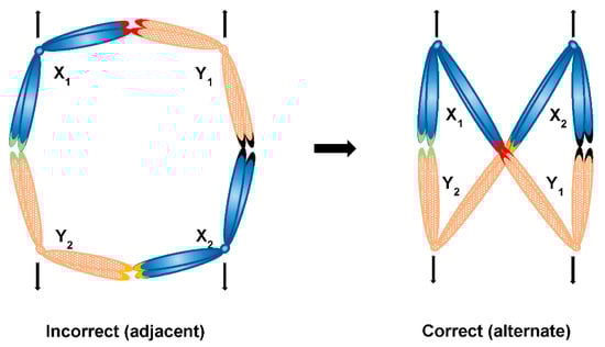 Possible segregation modes of a ring sex chromosome multiple consisting of four sex chromosomes (X1X2Y1Y2 system)—in case of a plain ring, segregation of sex chromosomes would be adjacent, which would in turn lead to the incorrect segregation of X and Y chromosomes together; in case of a figure eight shaped ring, alternate segregation is achieved leading to the correct segregation of Xs together and Ys together respectively; respective contacts of sex chromosomes (e.g., PARs) are depicted as coloured chromosome tips.