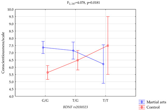 | Martial arts/control × BDNF rs2030323 | F2247 = 4.08 (p = 0.0181 *) | 0.032 | 0.721 | |||||||