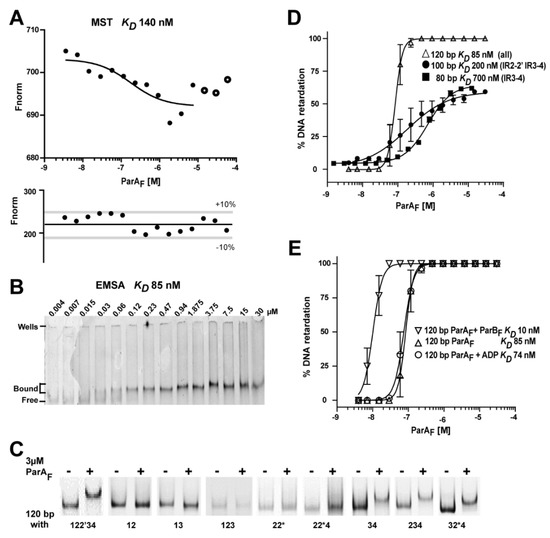 3.8. ParBF Increases ParAF Binding Affinity to the Promoter Region