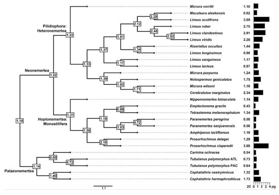 Phylogenetic tree of the studied samples and major nemertean lineages. Genome size (2C (pg)) is shown to the right of the tree as a black bar as well as in numerical form. Ancestral reconstruction of genome size for particular nodes is shown in white rectangles.