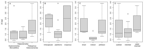 Boxplots of genome sizes (A): across studied lineages of Nemertea, (B): for different reproductive types (dev1), (C): for different developmental types (dev3) and (D): different habitats.